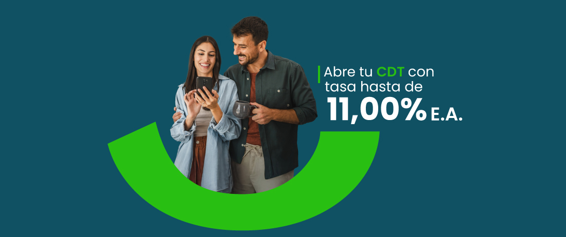 *La tasa del 11,00% E.A. aplica para CDT Digital de monto desde $300.000 a $1.000.000.000, con plazo de 1080 días. Tasa sujeta a cambios o modificaciones por parte del banco.