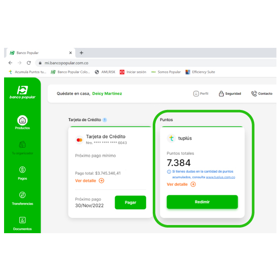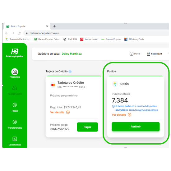 Busca la sección de puntos tuplús, allí podrás identificar cuantos puntos tienes acumulados y realizar proceso de redención dentro del portal Bancario o App y da clic en "Redimir".