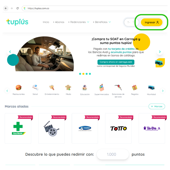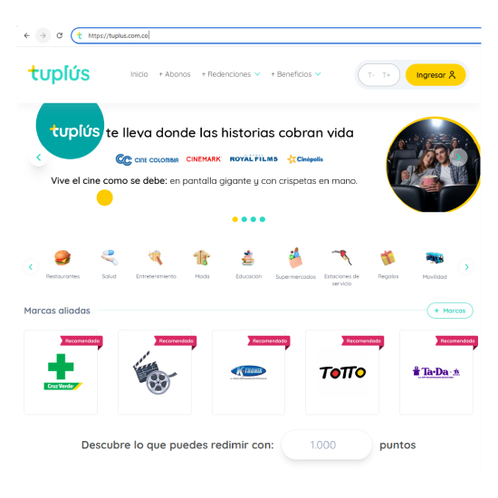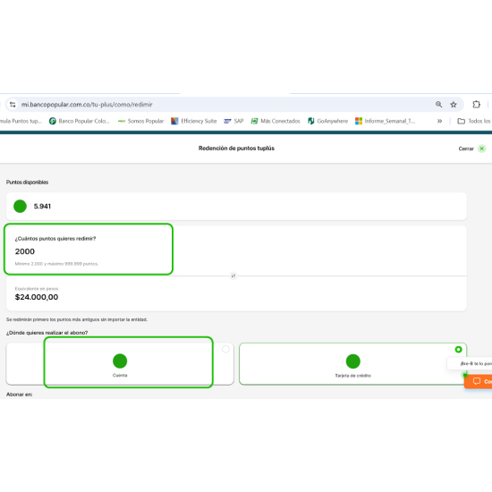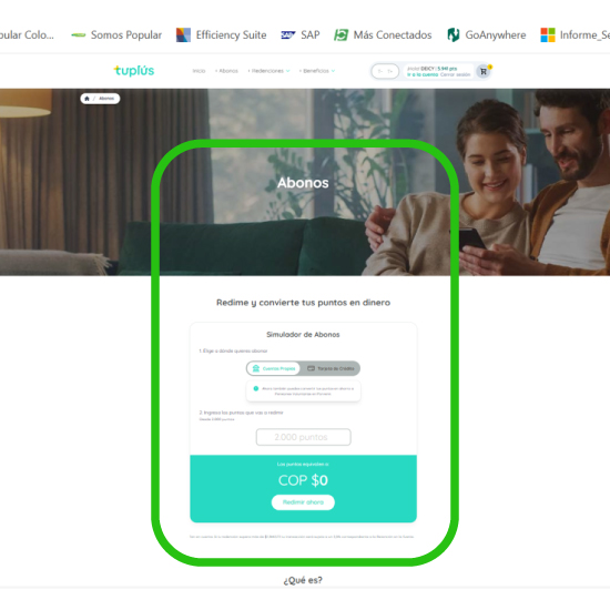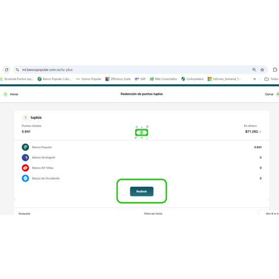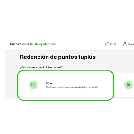 Busca la sección de puntos tuplús, allí podrás identificar cuantos puntos tienes acumulados y realizar proceso de redención dentro del portal Bancario o App y da clic en "Redimir". Listo ya ingresaste para redimir tus puntos.