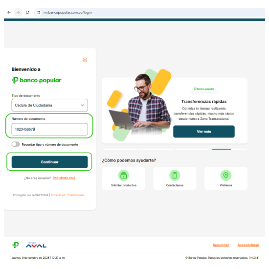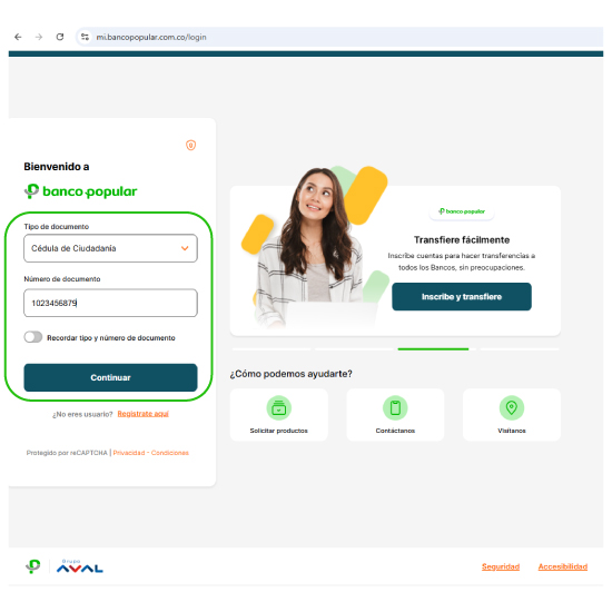 Ingresa al portal bancario o aplicación Banco Popular, selección el tipo de documento, digita tu número de identificación y clave y da clic en siguiente.