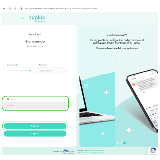 Digita la clave con la que ingresas a Banca Móvil o la App Banco Popular y da clic en "ingresar". Listo ya haz ingresado a tu portal de tuplús!
